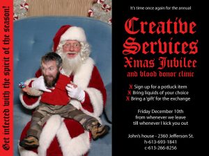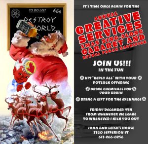 I’ve done lots of e-vites over the years. Here are two for departmental Xmas parties in the past. With a theme of dark humor…