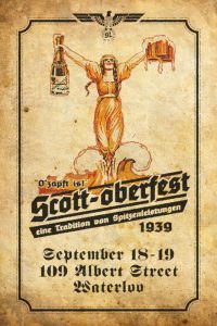 A poster for an annual get together. Starting with the vintage image of ‘Lady Alcohol’ from an old advert; the German theme comes from the event taking place around Oktoberfest in Waterloo which is near Kitchener (which had many German settlers in the mid 1800’s and was once called Berlin). The 1939 is because there was no Oktoberfest that year (from 1939 – 1945, for reasons that should be obvious).